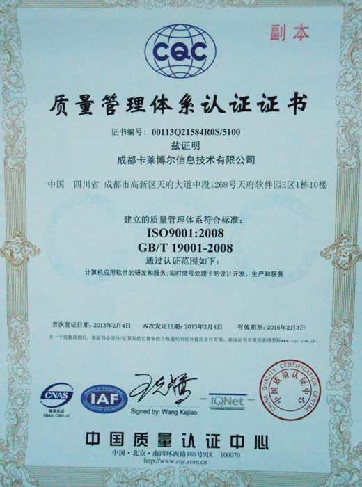 卡莱博尔一直十分重视质量体系认证相关工作,由公司总裁鲁方祥亲自带队,经过内审、管理评审、第三方审核等过程,于2013年2月卡莱博尔通过了中国质量认证中心的评审,获得了ISO9001:2008质量管理体系认证证书。