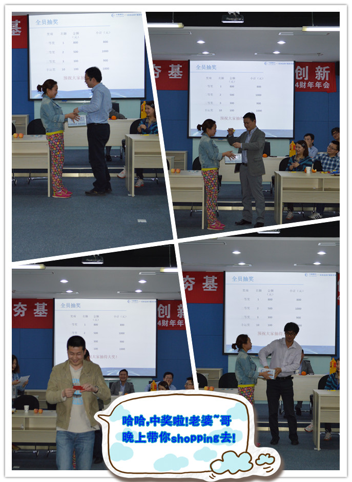 年终总结大会上公司总裁对2013年公司发展历程和取得的成绩进行了回顾和总结,同时也对2014年公司的发展战略进行了部署,提出2014年是公司发展极为重要的一年,也是公司转型的一年,期望全体员工在新的一年勤奋敬业,再创佳绩。