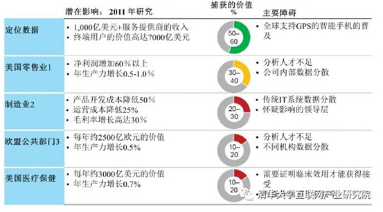 麦肯锡2011 年的报告预估了大数据与分析在五个特定领域创造价值的潜力。今天再次考量这个议题,发现进展并不均衡,并且大量的价值仍在讨论当中。我们看到定位服务和美国零售业取得进展最大(下图所示)。