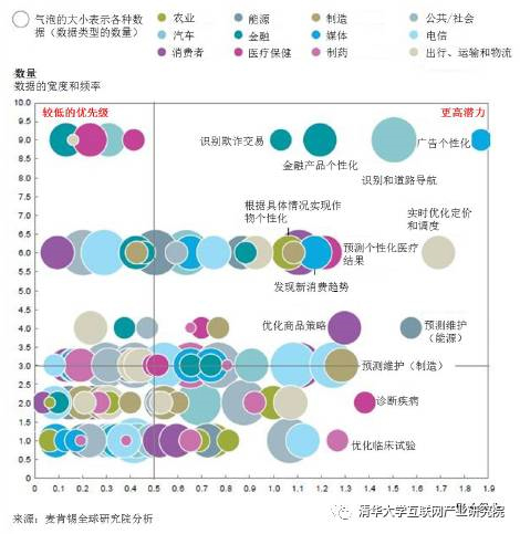 我们分析了12 个行业中120 个机器学习的潜在用例,并调查了600 多位行业专家对其潜在影响的看法。最大的发现是机器学习的潜在应用非常广泛;每个用例被该行业中的至少一位专家确定为行业中的前三个用例之一。我们在下图中绘制了前120 个用例。y 轴显示了可用数据的数量(包括其宽度和频率),而x 轴显示了基于600 多位行业专家调查的潜在影响。气泡的大小反映了可用数据来源的多样性。