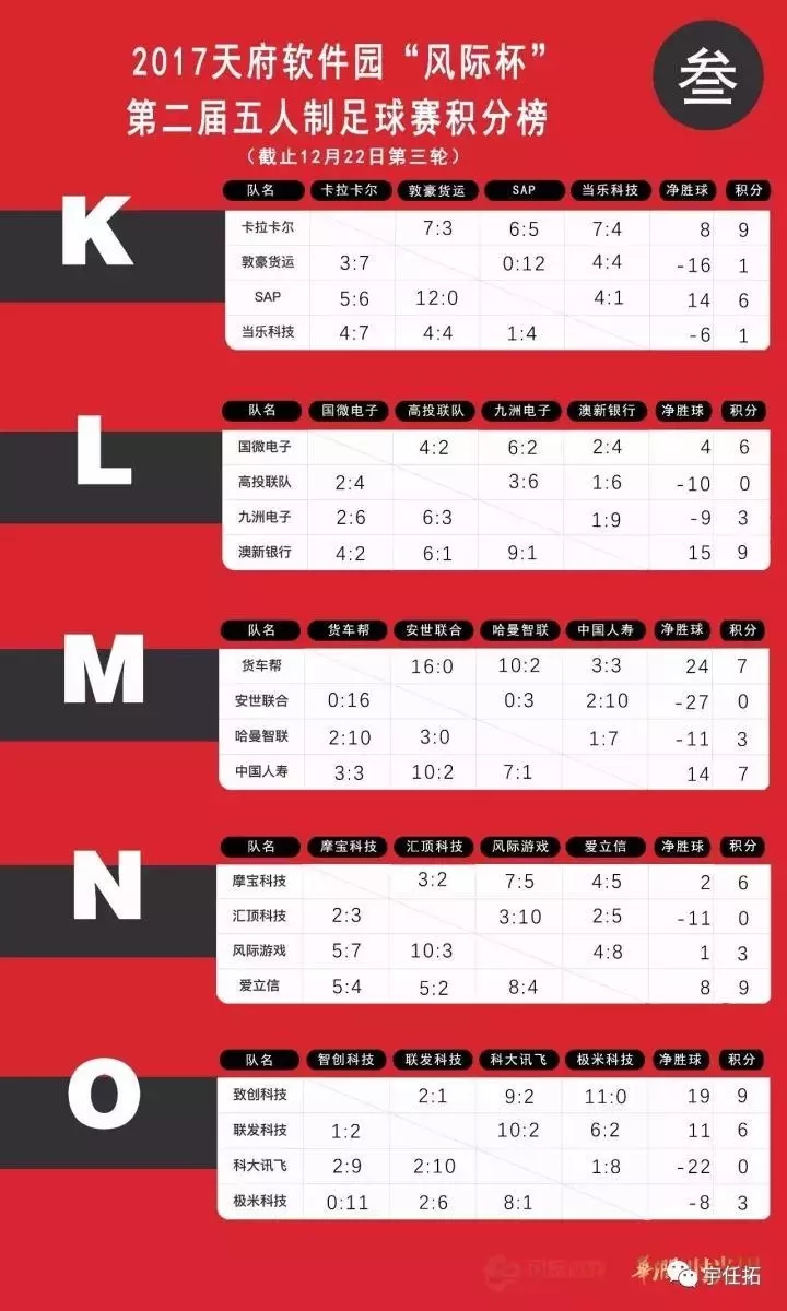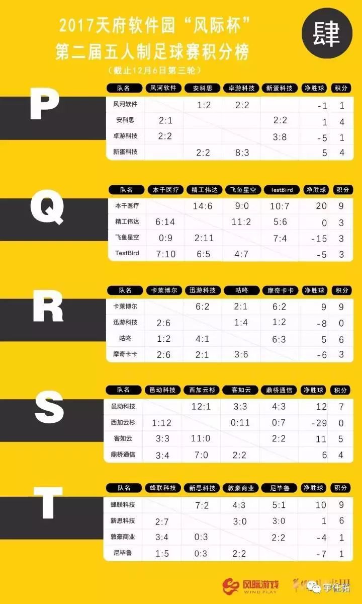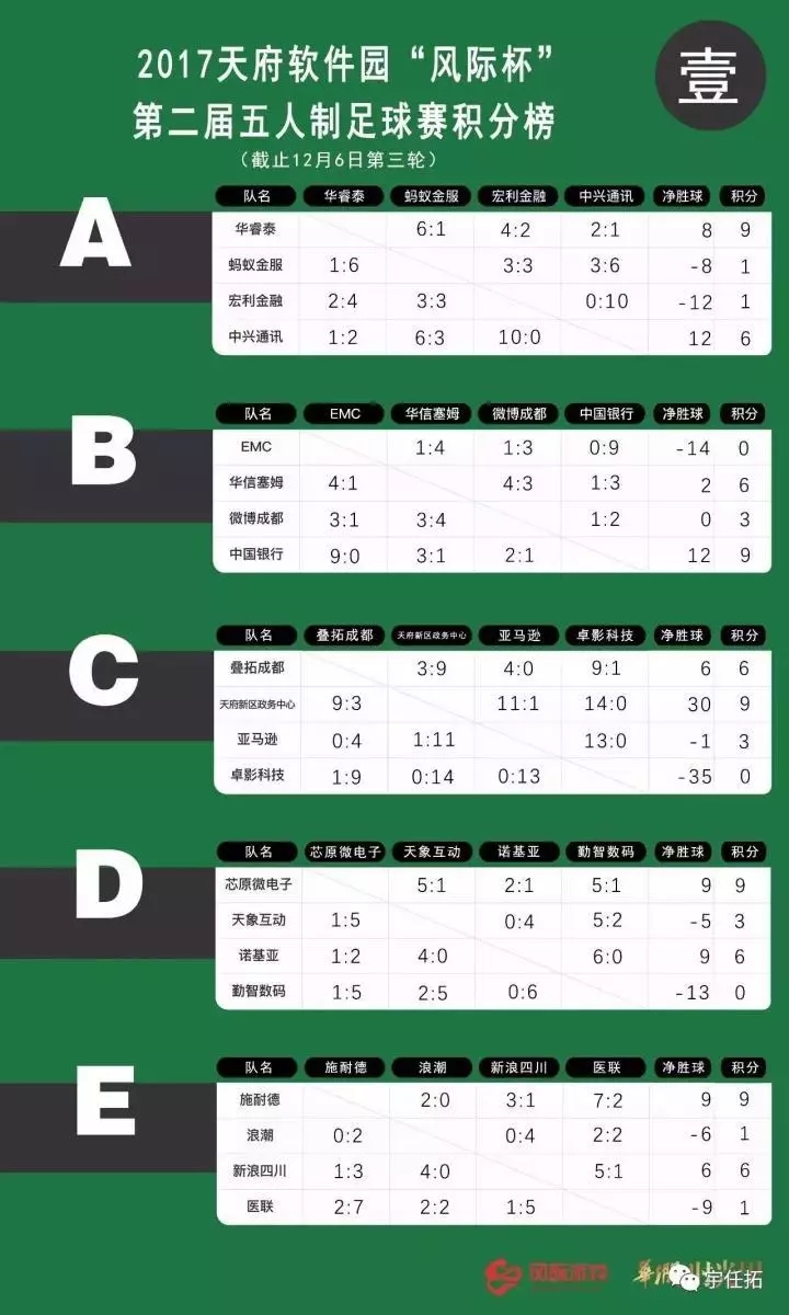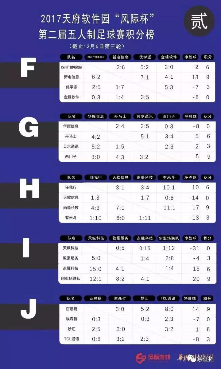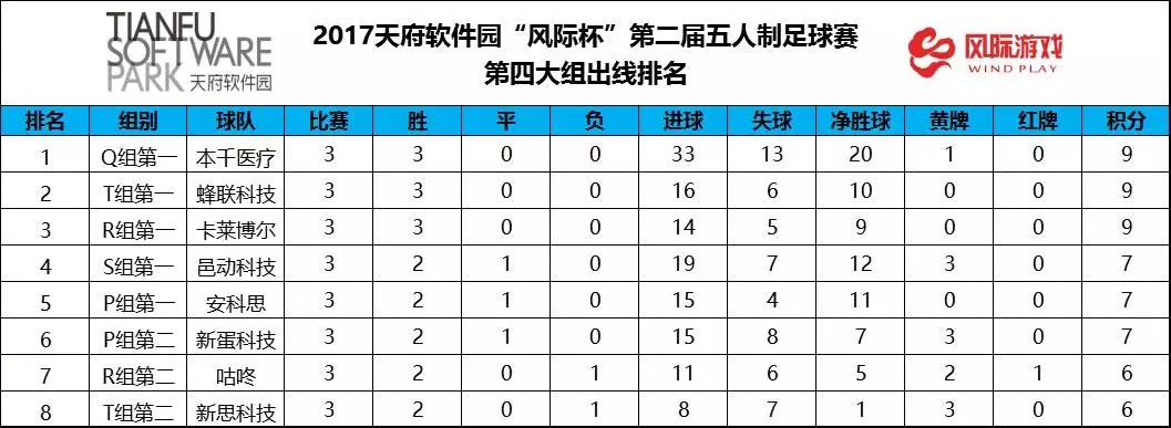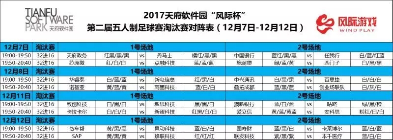 2017天府软件园“风际杯”第二届五人制足球赛的小组赛完赛,晋级32强的队伍也随之诞生,而比赛中落得下风的48支队伍则遗憾出局,不得不与本次比赛说再见 。