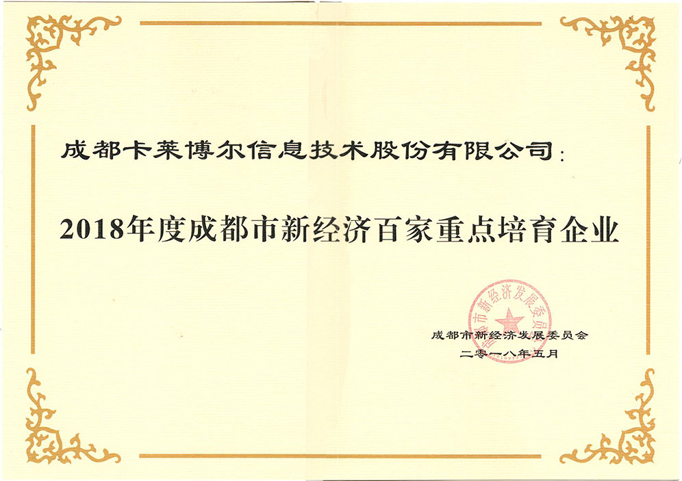 本次新经济会议对成都市100家优秀新经济企业、企业优秀人才进行了表彰。成都卡莱博尔信息股份有限公司凭借专业的技术支撑,强劲的发展势头,强势入围,获得“2018年度成都市新经济百家重点培育企业”的殊荣;卡莱博尔董事长鲁方祥先生被授予“2018年度成都市新经济百名优秀人才”的称号。